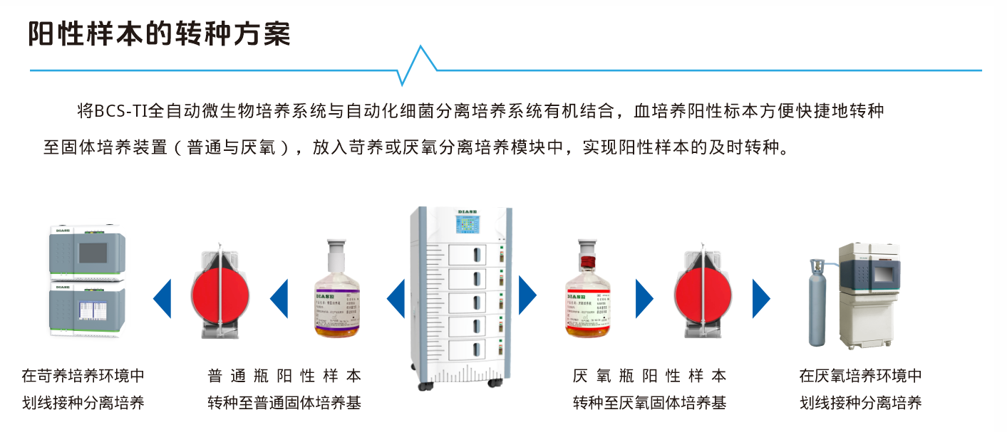 完整的血液培養(yǎng)理念 完整的血液培養(yǎng)涵蓋血液樣本的增菌培養(yǎng)及陽性樣本在固體培養(yǎng)基上完成的分離培養(yǎng)兩部分。 全自動微生物培養(yǎng)系統(tǒng)對培養(yǎng)瓶進行增菌培養(yǎng),并采用國際先進的CO2直測技術,敏感而快捷地對培養(yǎng)瓶內(nèi)CO2濃 度進行直接感應與監(jiān)測,結合科學的算法模型,及時、快速、準確地報告陽性結果。 對于陽性血液培養(yǎng)瓶,普通瓶轉種至普通固體培養(yǎng)基上,在苛養(yǎng)環(huán)境中完成劃線接種與分離培養(yǎng);厭氧瓶轉種至厭 氧專用固體培養(yǎng)基上,在厭氧環(huán)境中完成劃線接種與厭氧分離培養(yǎng)。